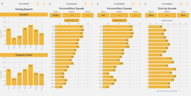 Just going over the first session in the Full Speed Spectrum program quickly, it was a case of 195g at full swing, with an average of 86mph, 145g at full swing, with an average of 92mph, back-to-back on the 145g but with a max swing and an average of 95mph and then a max swing set with the 195g with an average of 92mph.